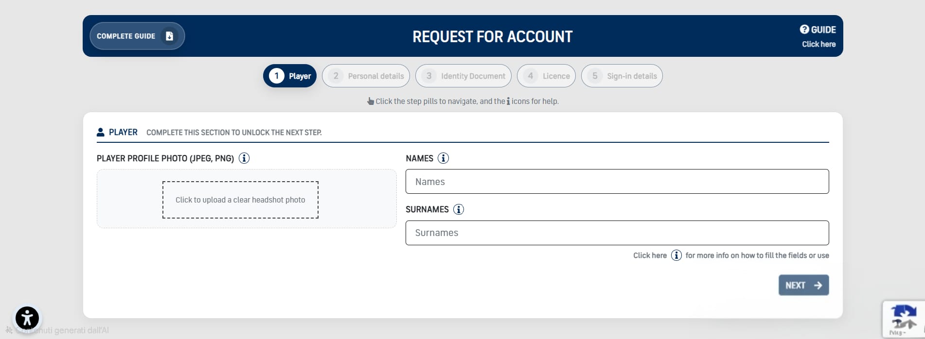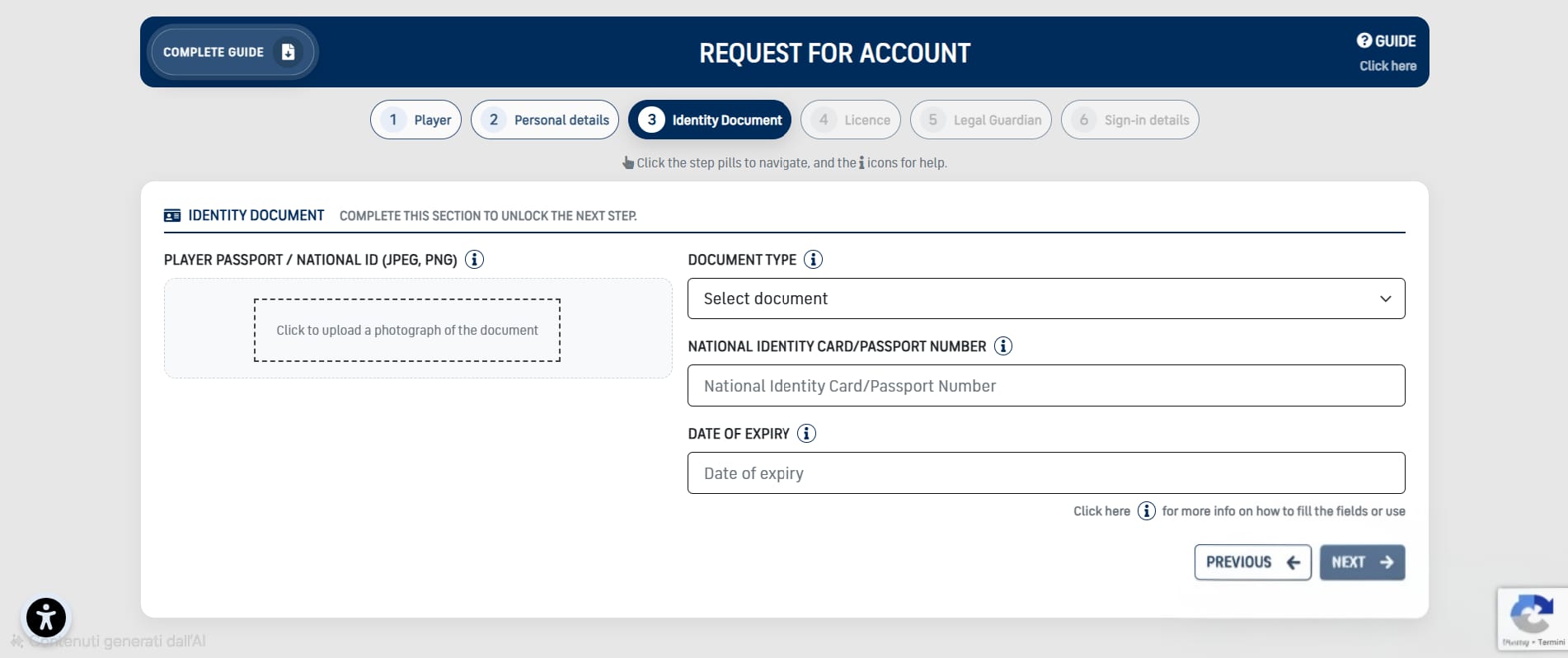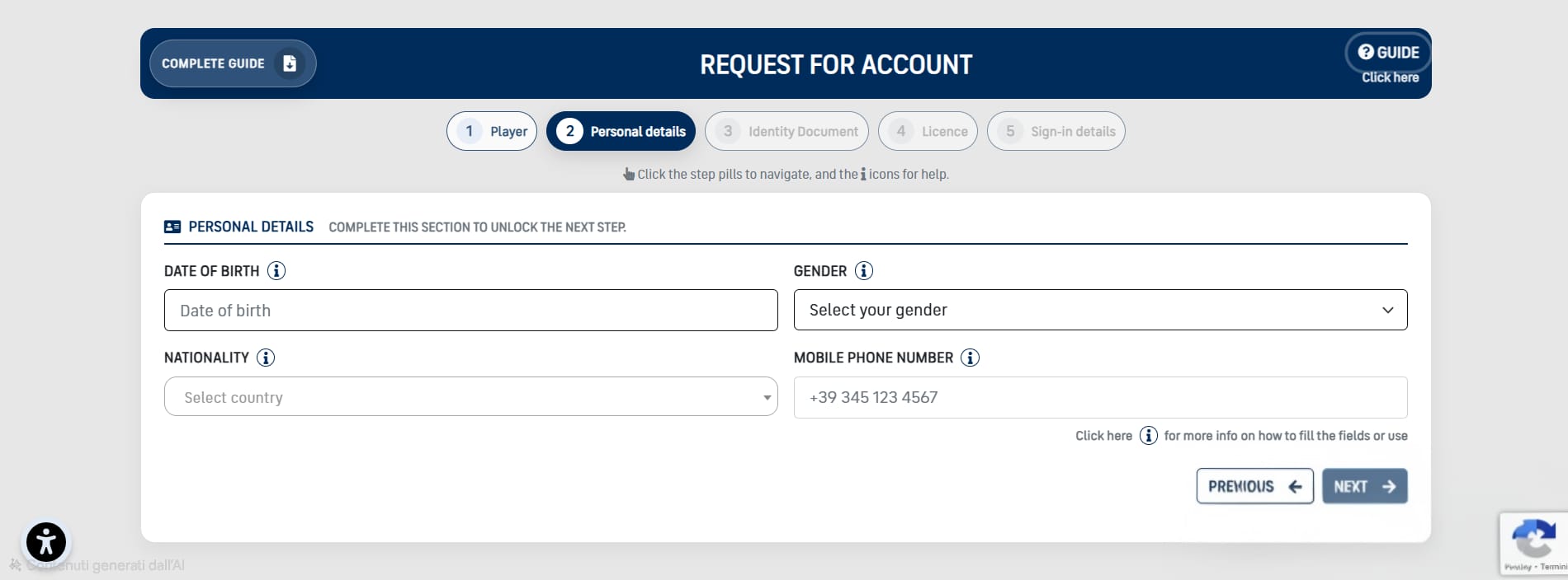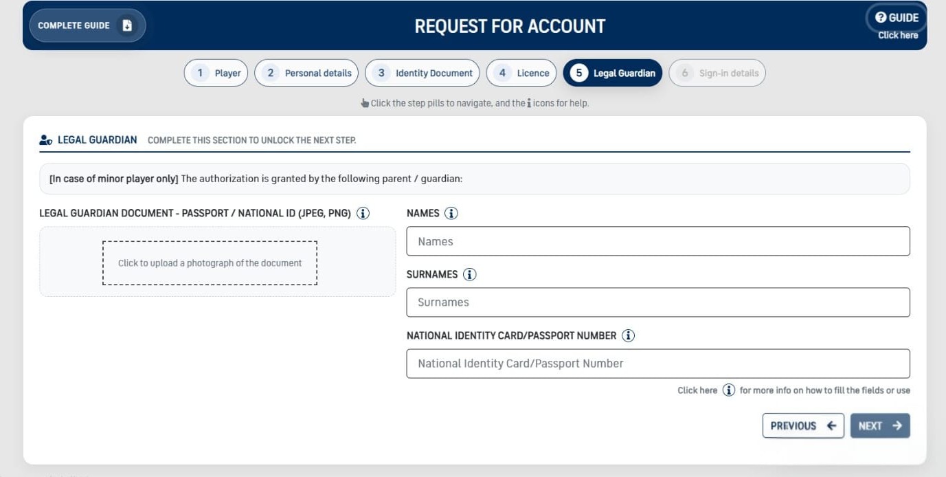 Select the player date of birth. If the player is a minor, the Legal guardian step becomes mandatory.