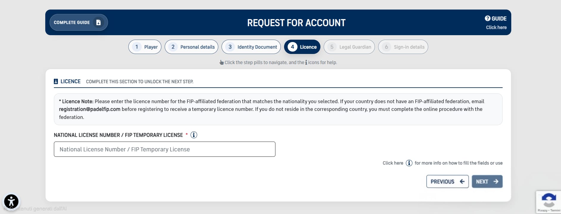 Please enter the license number for the FIP-affiliated federation that matches the nationality you selected. If your country does not have an FIP-affiliated federation, email registration@padelfip.com before registering to receive a temporary license number.